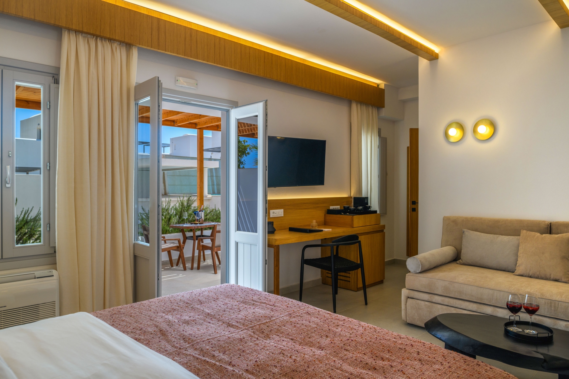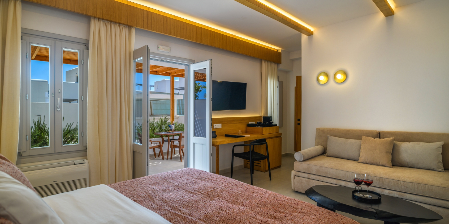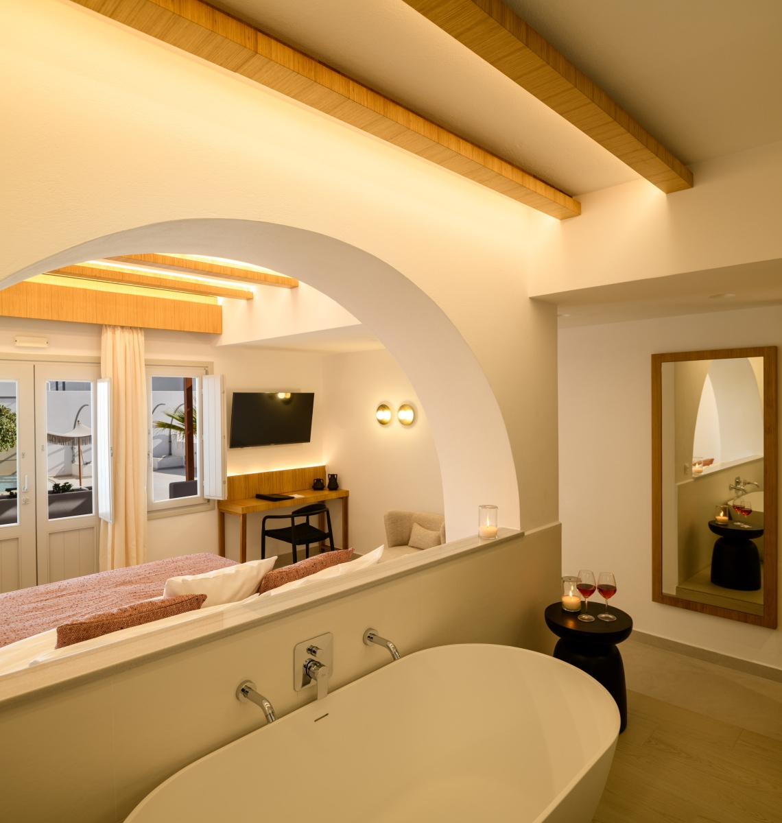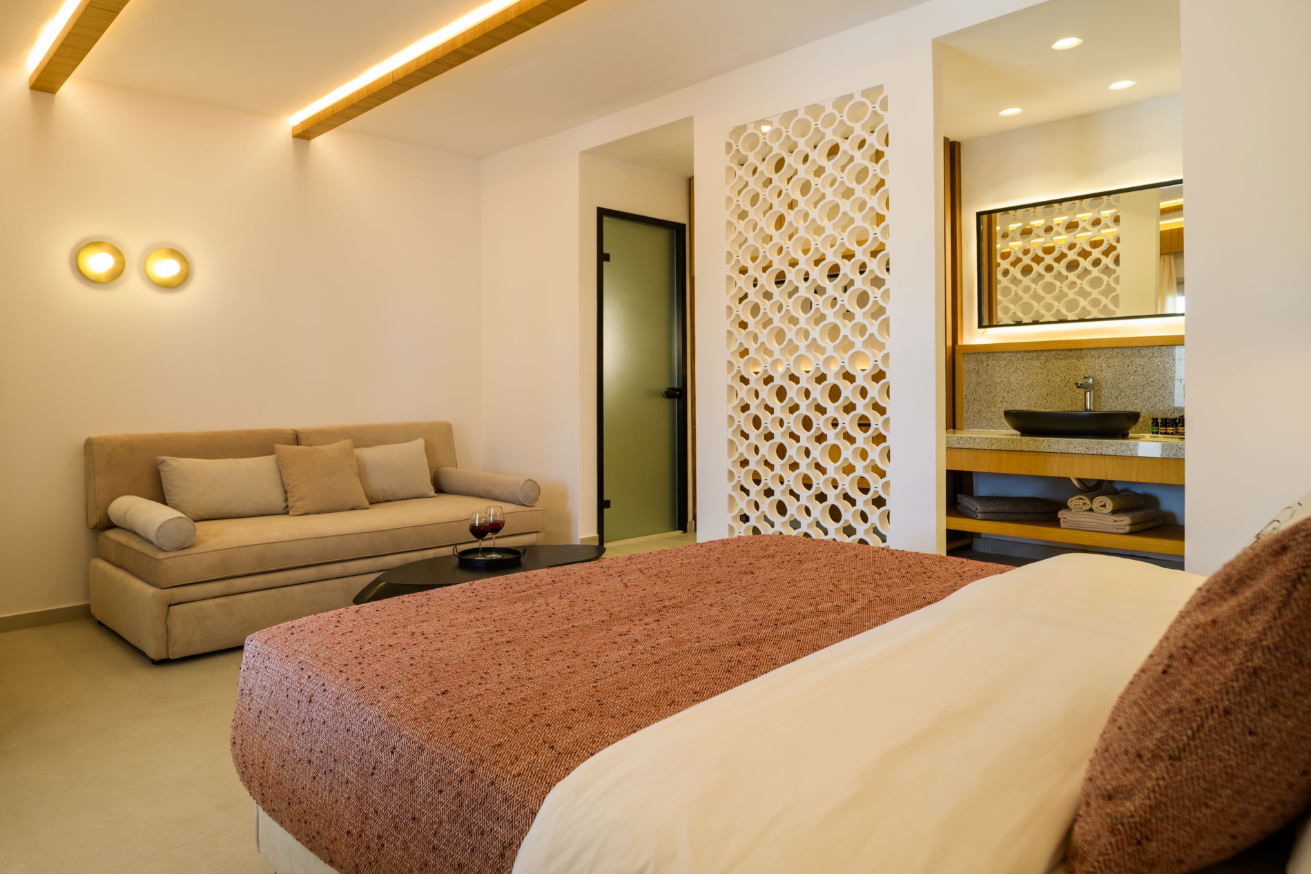 This 50 m² connected suite features two separate bedrooms with king-size beds, modern décor, and private verandas with cozy seating areas. Enjoy the comfort of added space while staying just moments away from the beauty of Santorini.