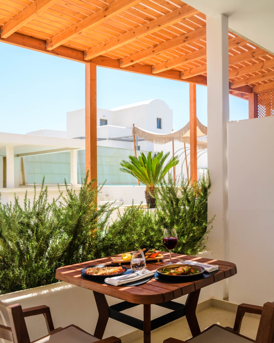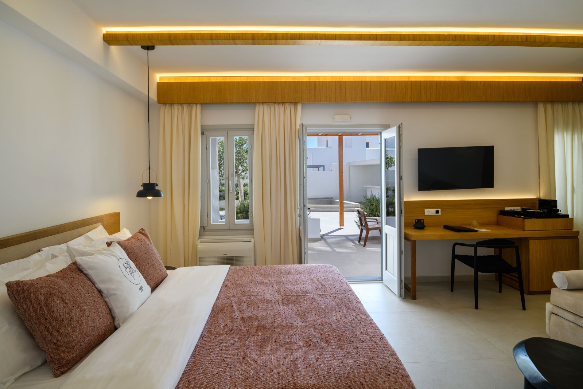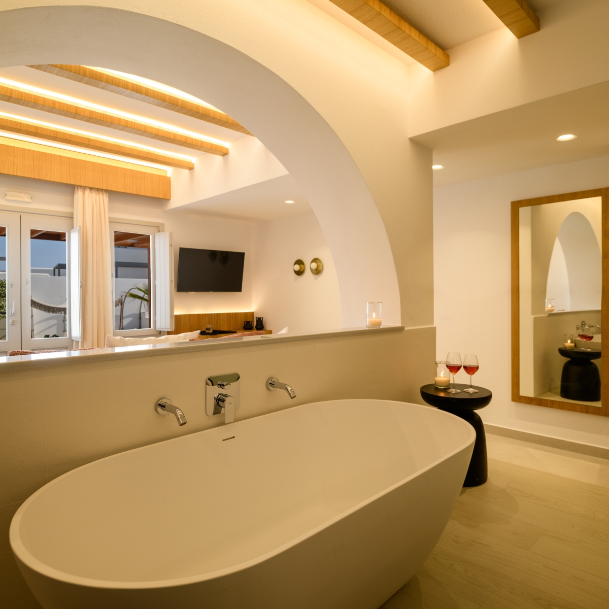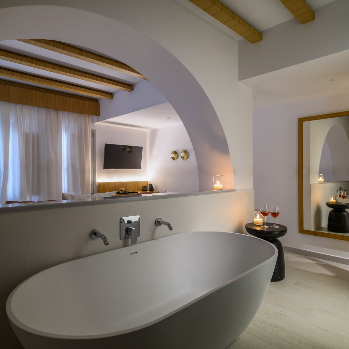 This 50 m² connected suite features two separate bedrooms with king-size beds, modern décor, and private verandas with cozy seating areas. Enjoy the comfort of added space while staying just moments away from the beauty of Santorini.