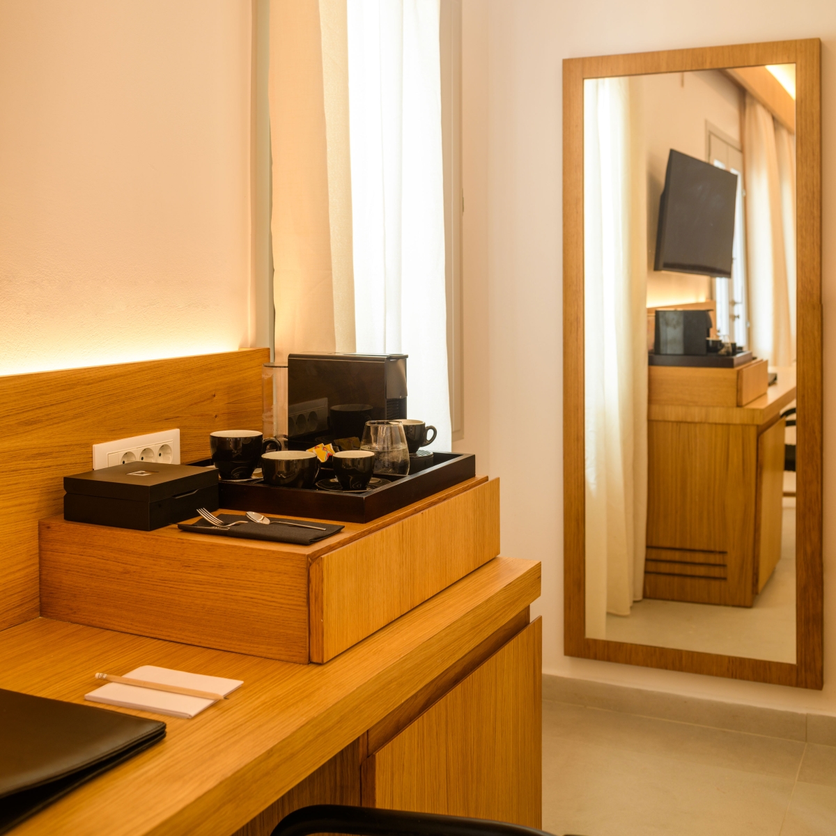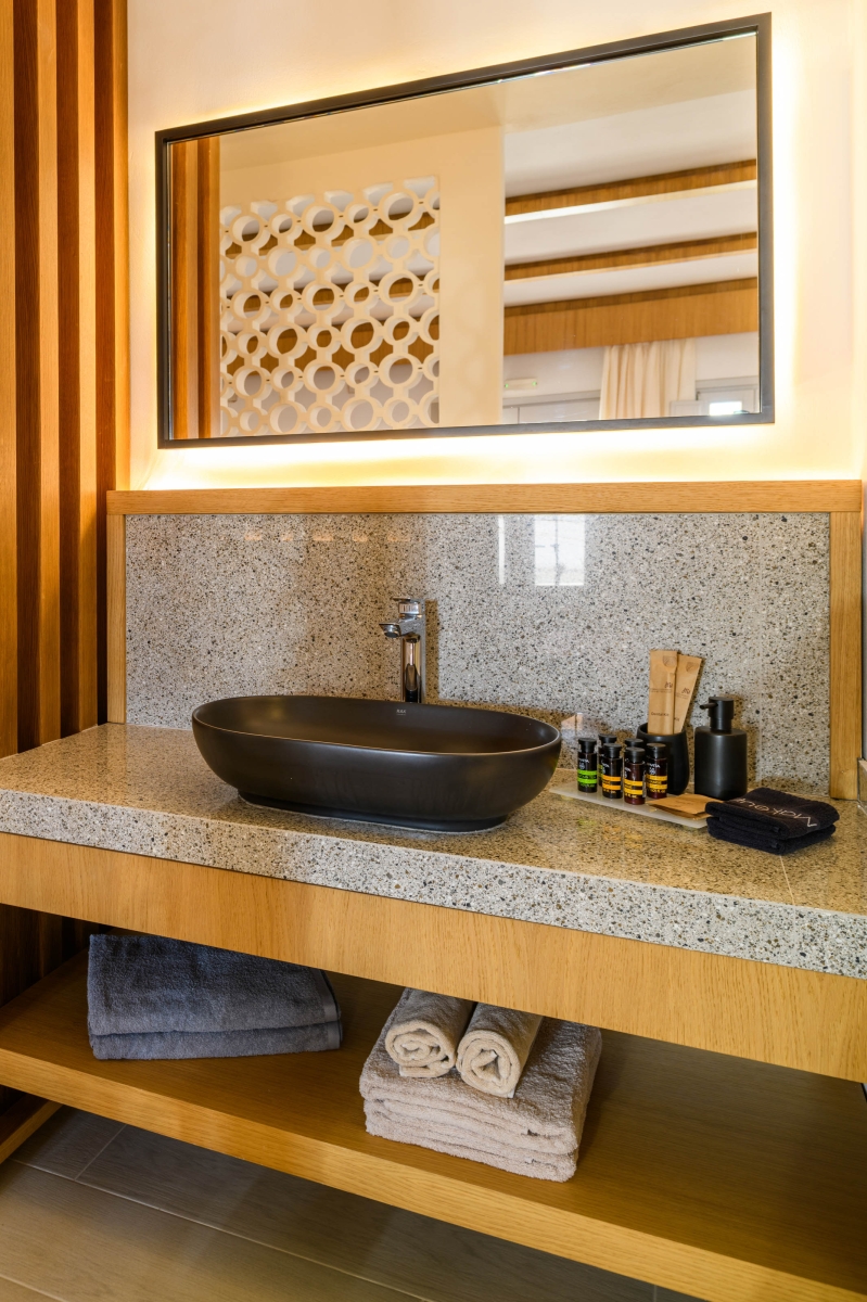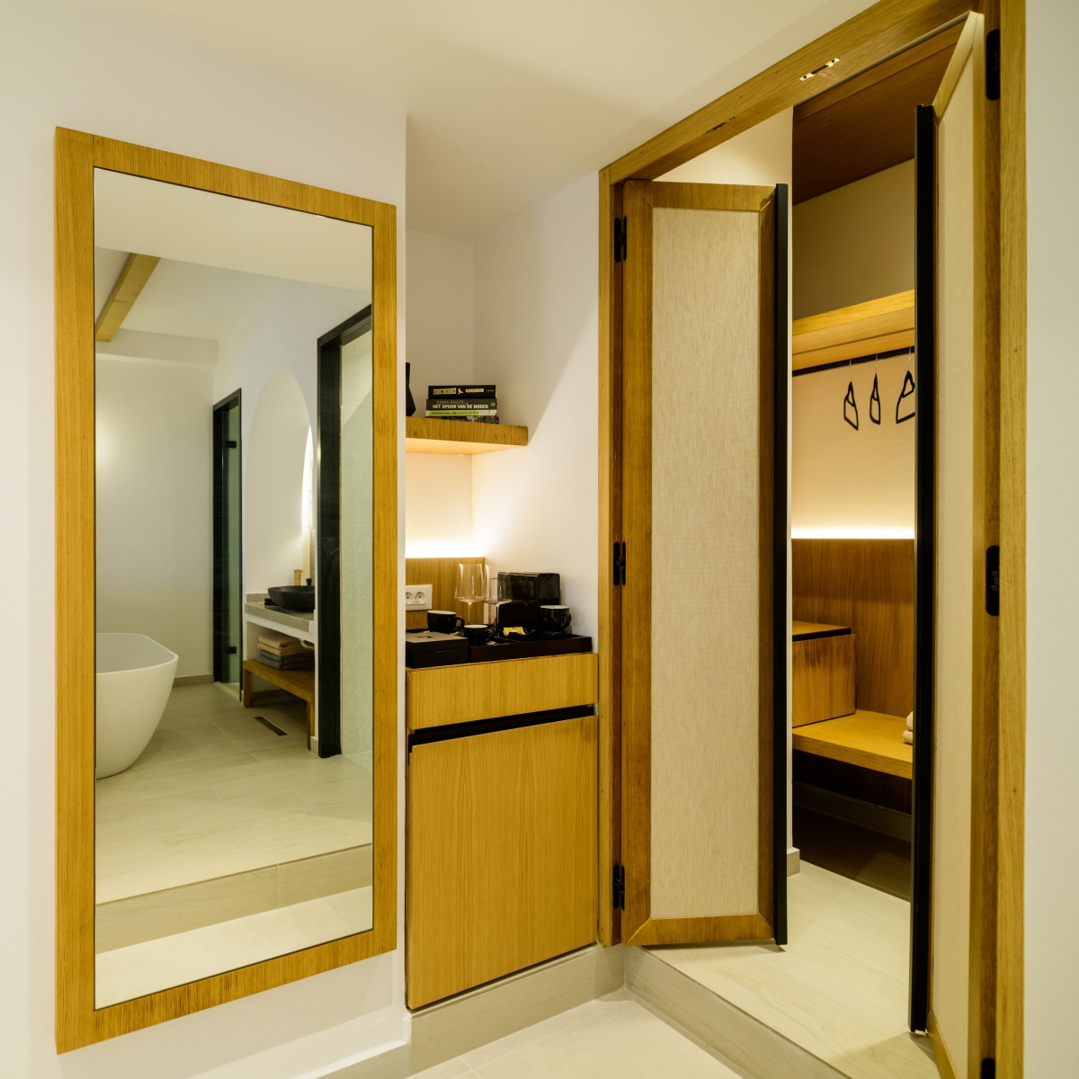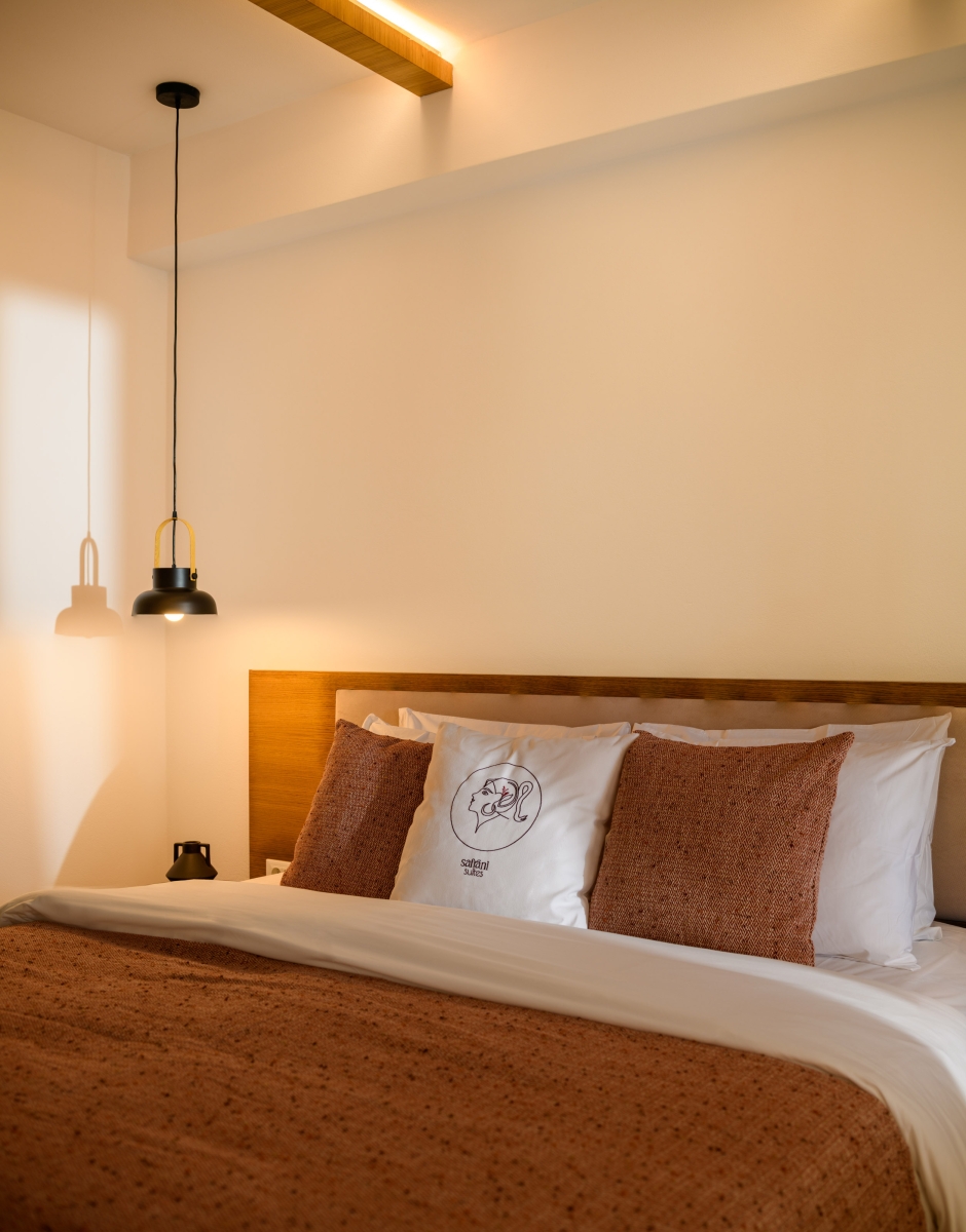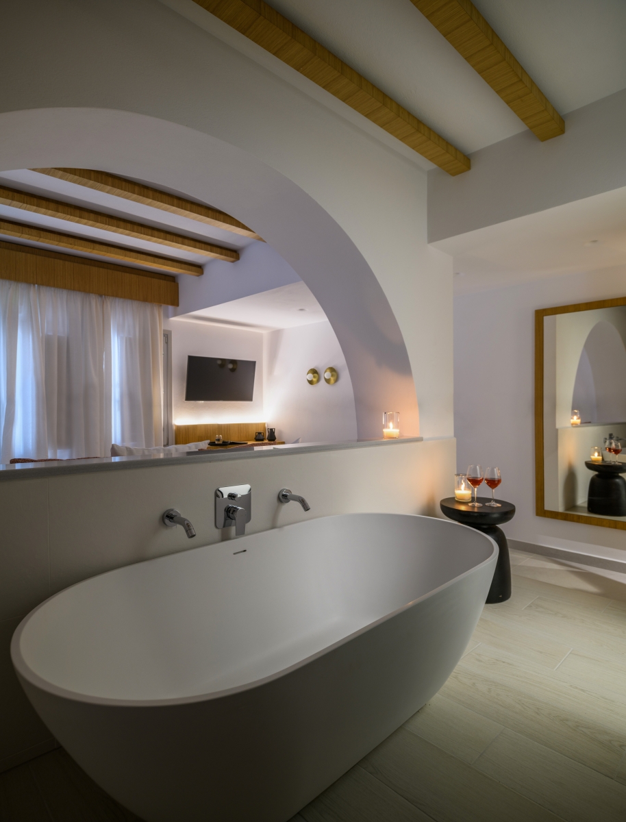 This 50 m² connected suite features two separate bedrooms with king-size beds, modern décor, and private verandas with cozy seating areas. Enjoy the comfort of added space while staying just moments away from the beauty of Santorini.