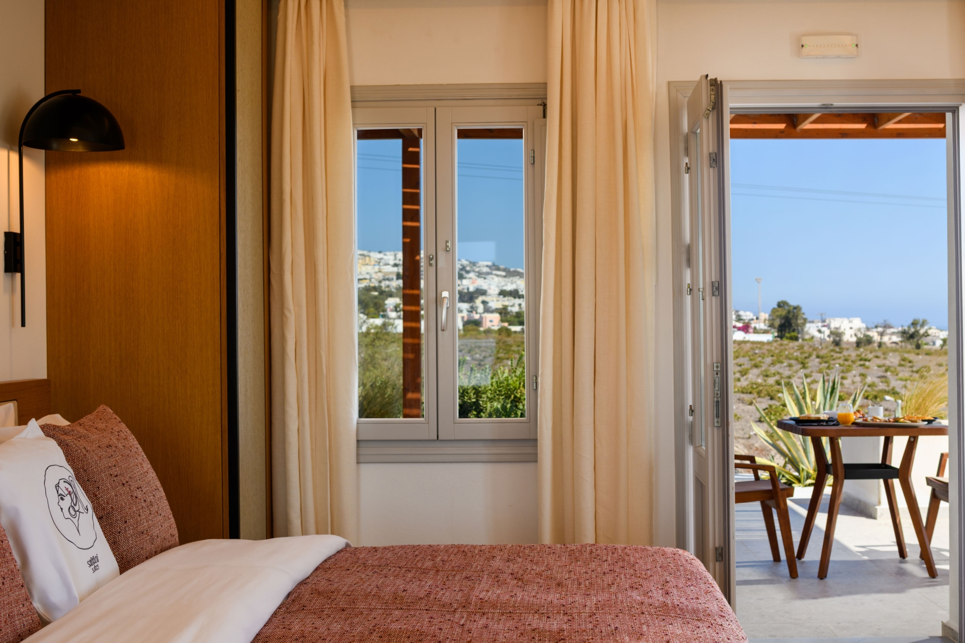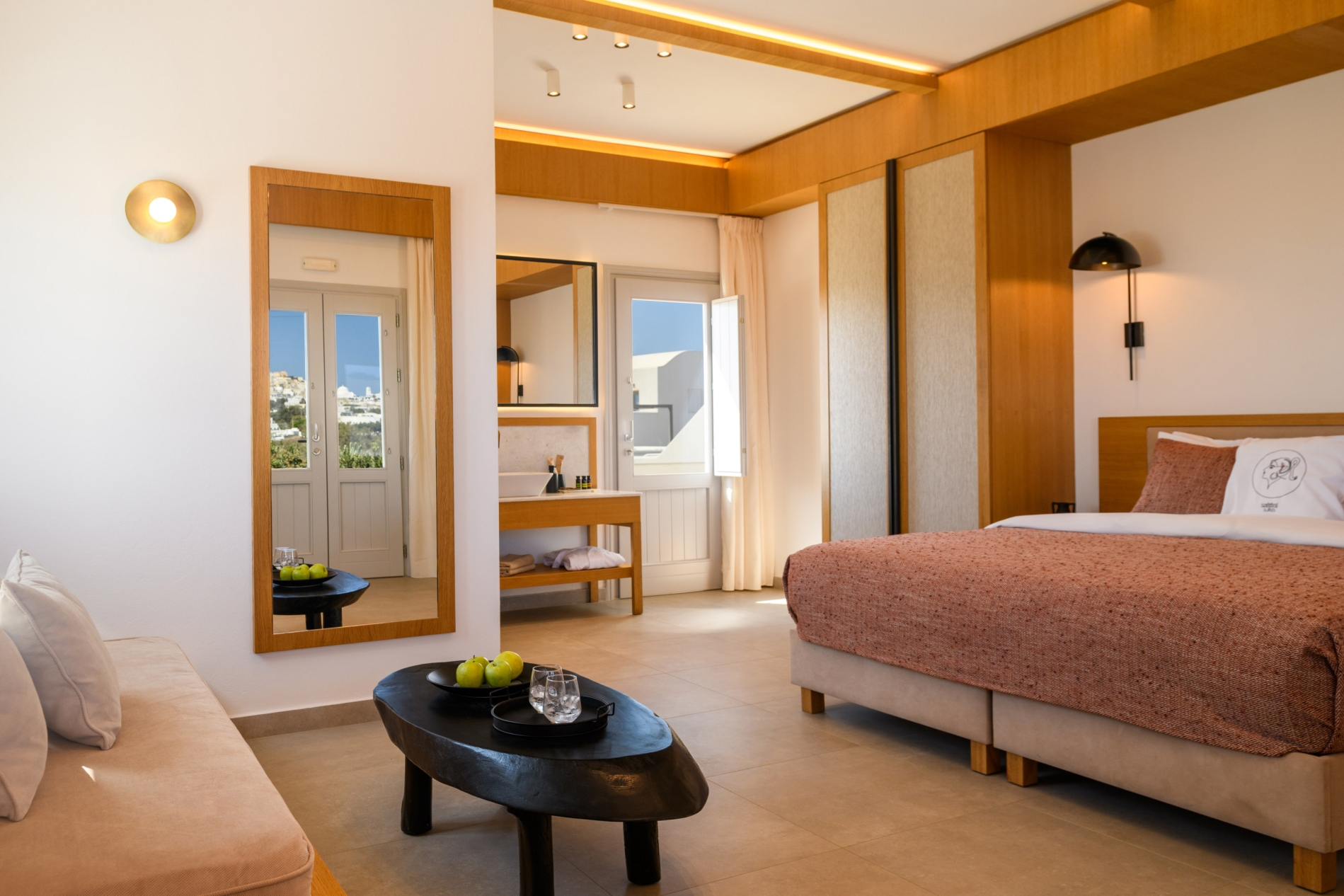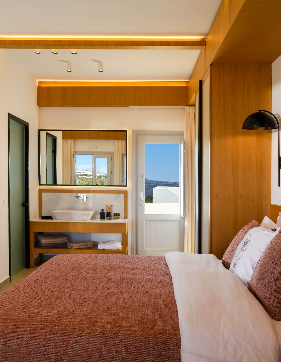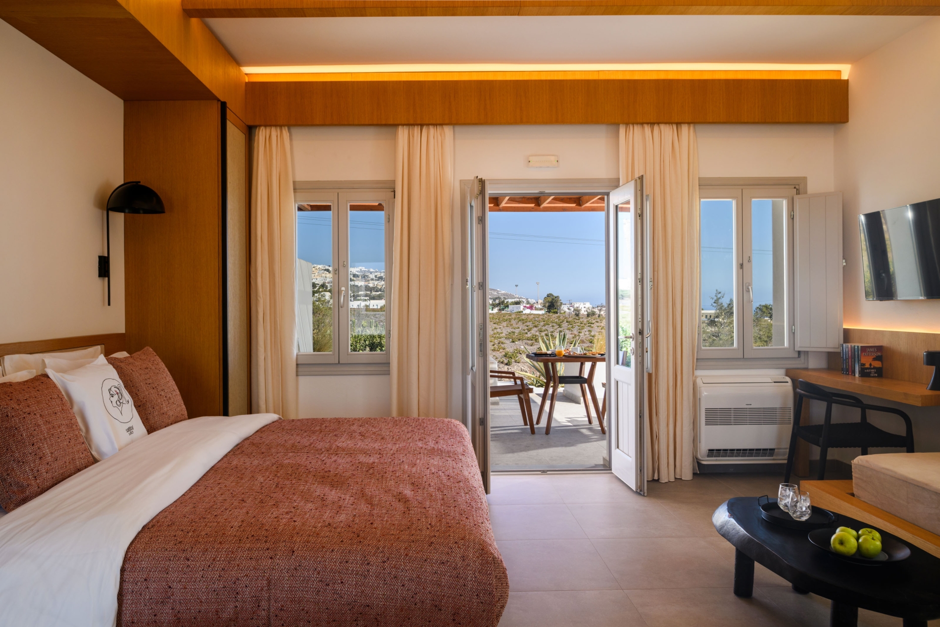 Wake up to sweeping Santorini views in a serene open-plan space designed for unforgettable moments.