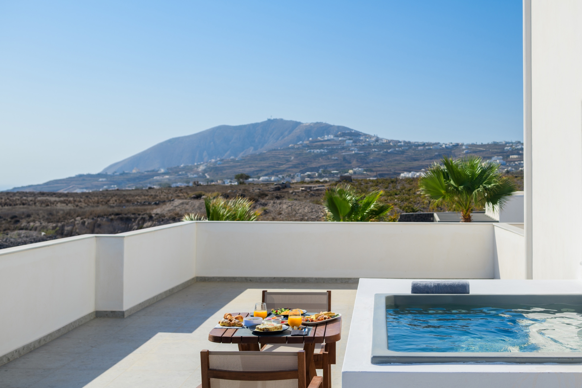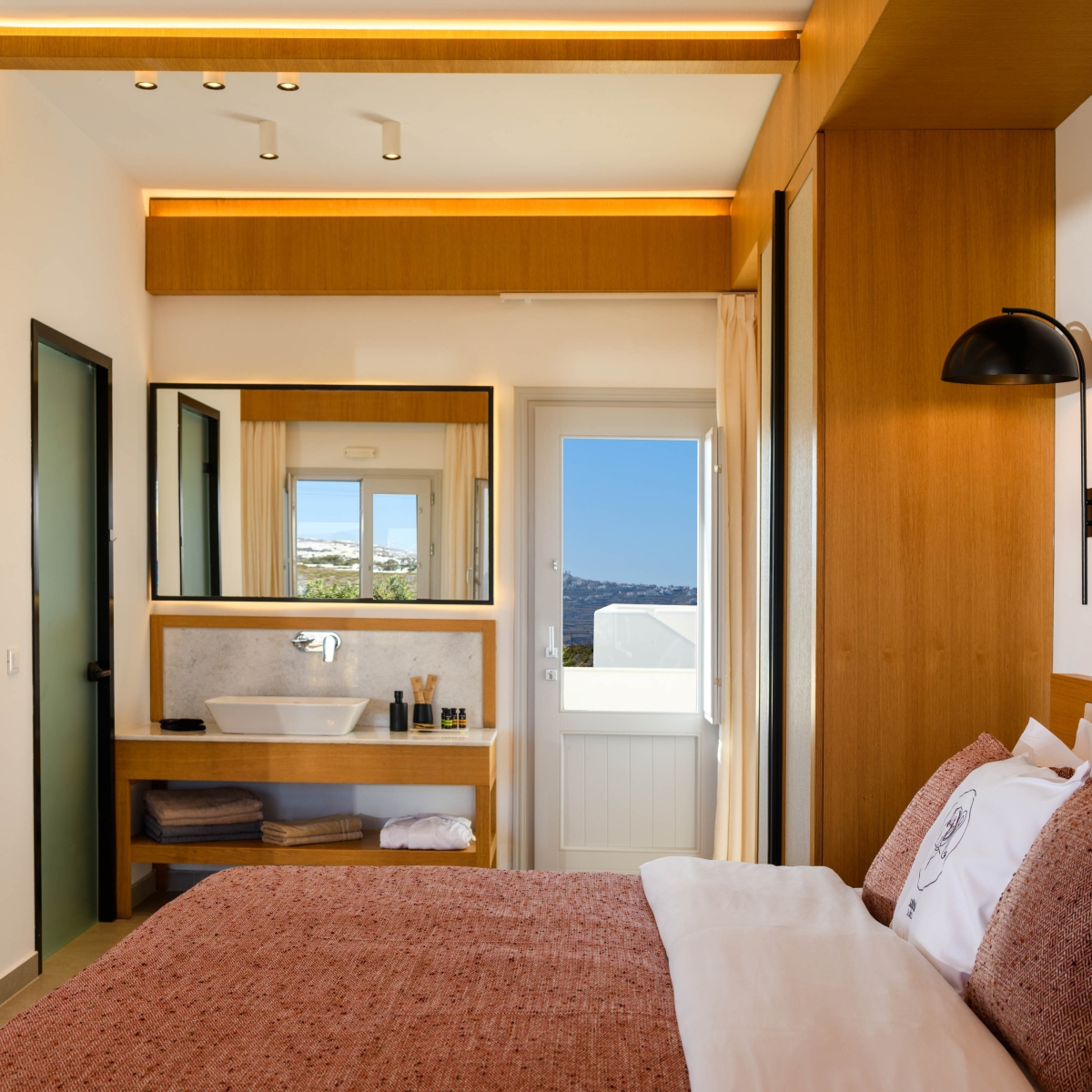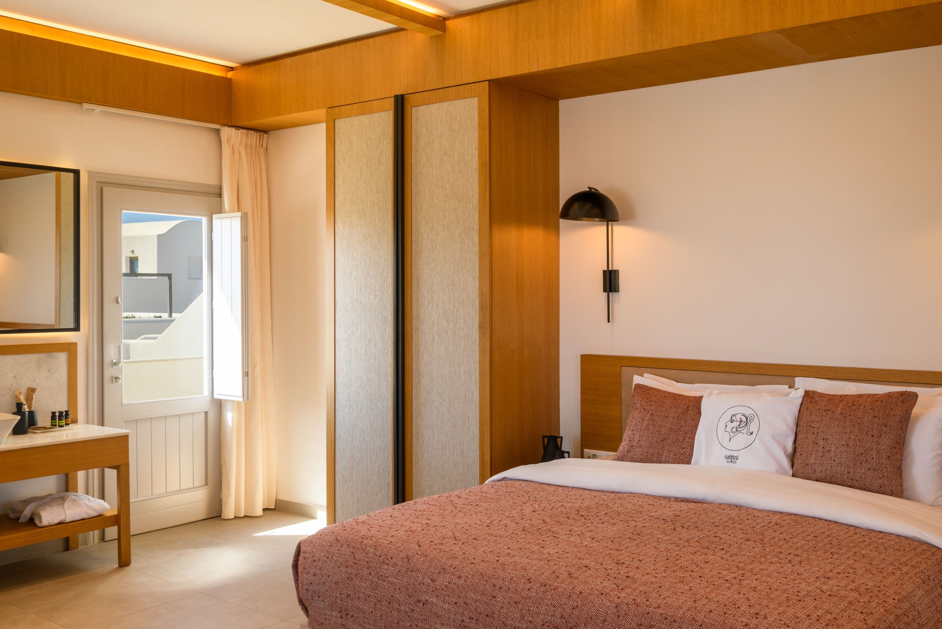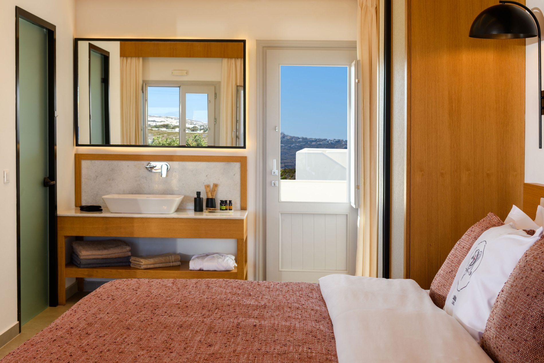 Wake up to sweeping Santorini views in a serene open-plan space designed for unforgettable moments.