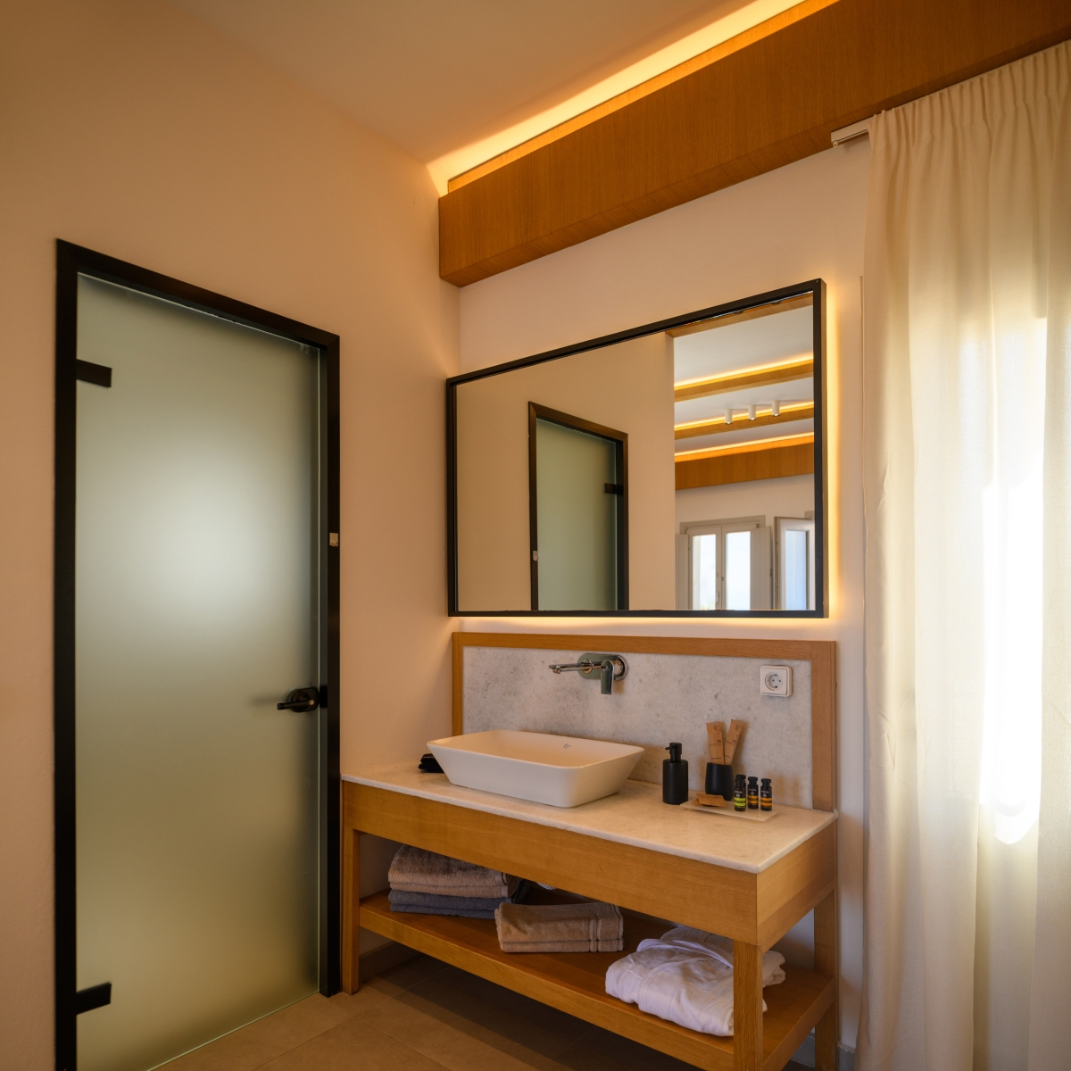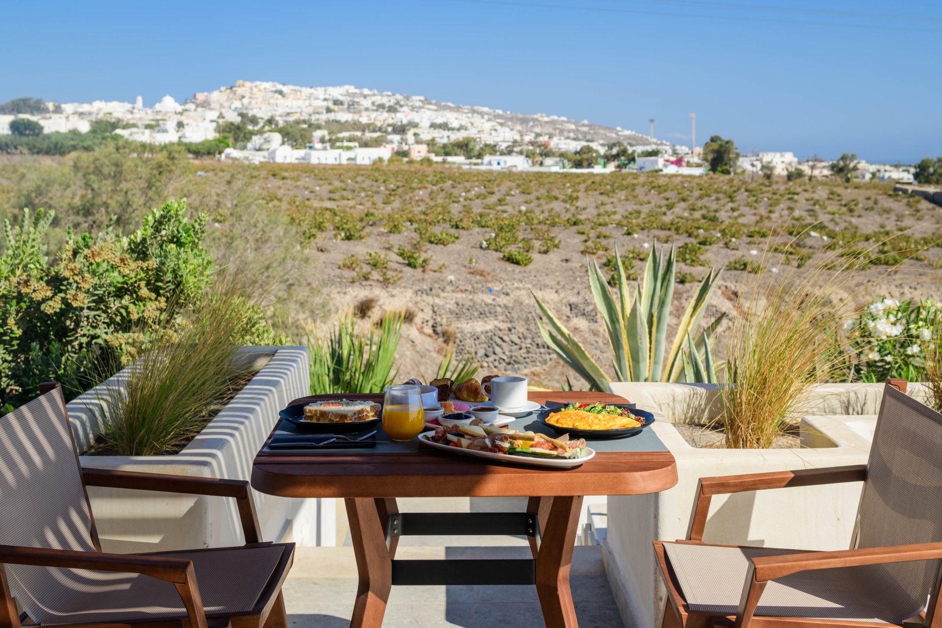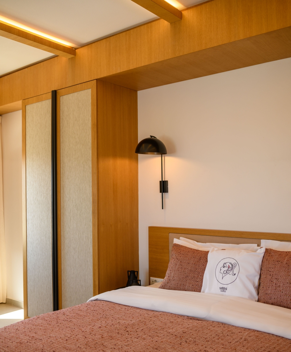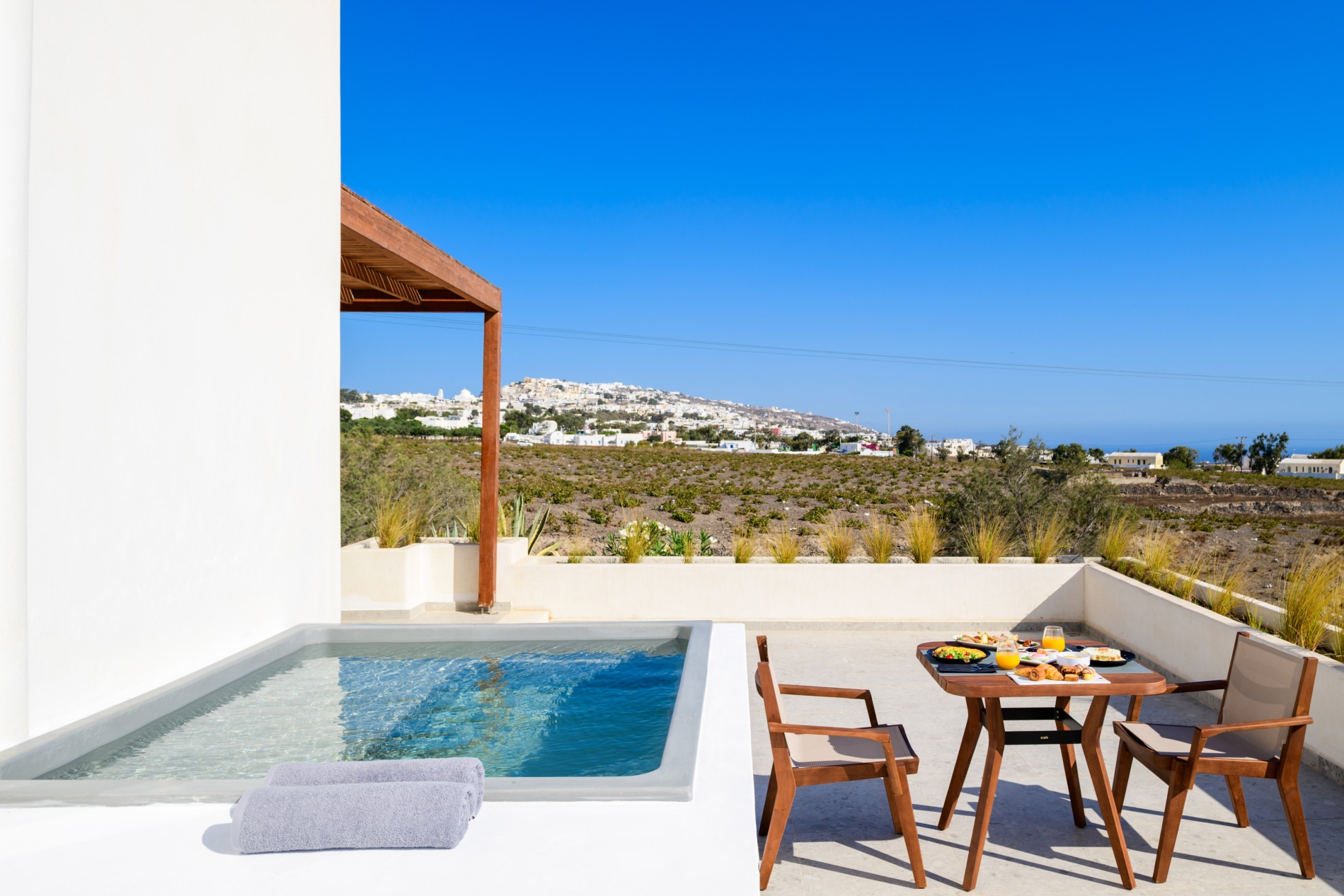 Wake up to sweeping Santorini views in a serene open-plan space designed for unforgettable moments.