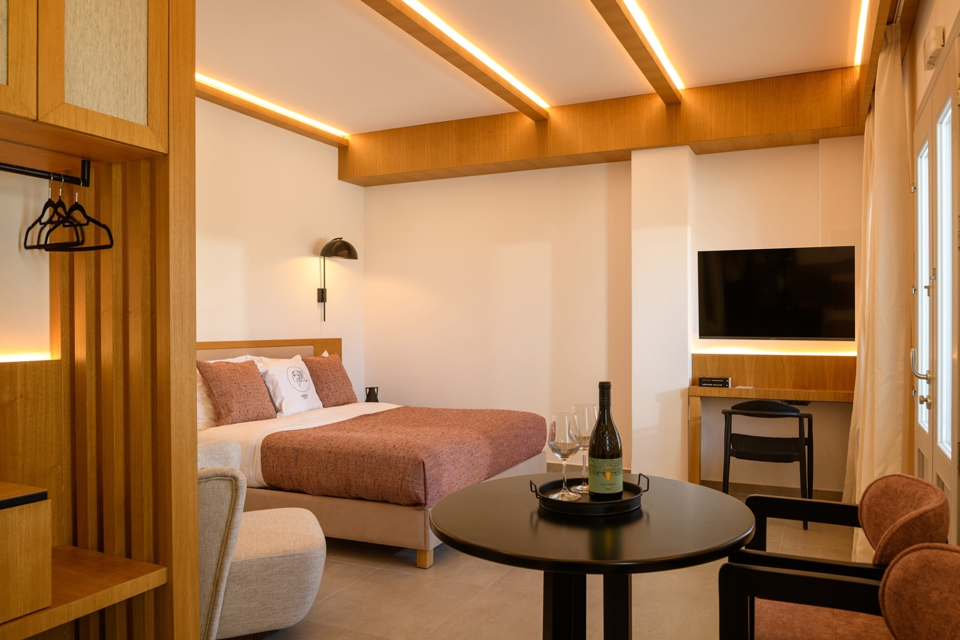 Spanning 45 m², this suite includes a king-size or twin bed, a refined bathroom, and a private balcony overlooking the sea. The outdoor hot tub offers a wonderful place to relax and enjoy Santorini’s famous golden hours.